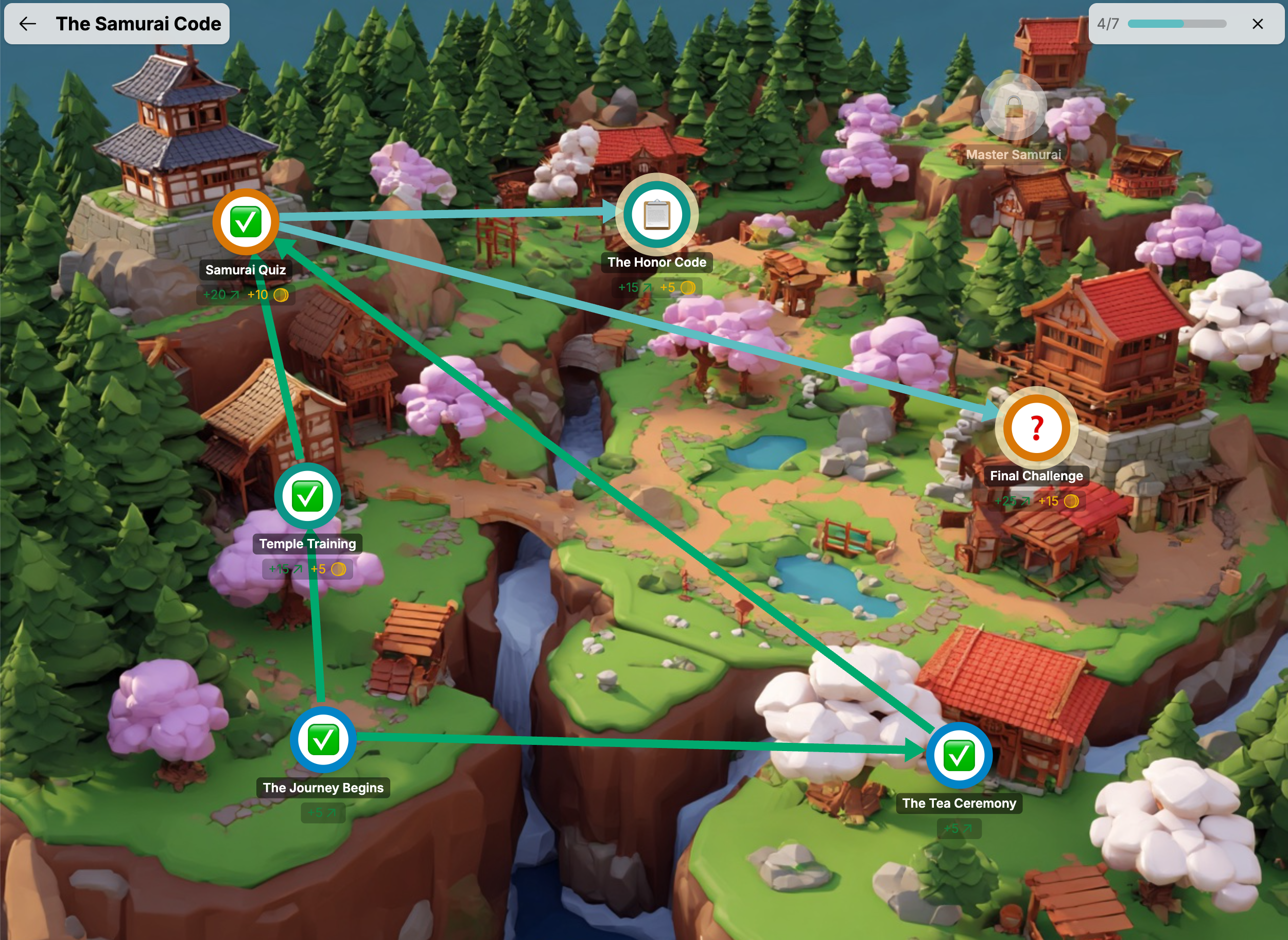 Wenn du einen Quest öffnest, siehst du eine Vollbild-Karte mit Zielen (Knoten), die durch Pfade verbunden sind. Jedes Ziel ist farbcodiert, um deinen Fortschritt zu zeigen:
