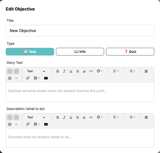Quest-Ziele verwenden einen Rich-Text-Editor für die Felder Story-Text und Beschreibung. Damit können Sie über normalen Text hinausgehen – fügen Sie Formatierungen, Bilder, Links und sogar YouTube-Videos hinzu, um Ihre Quests ansprechender zu gestalten.