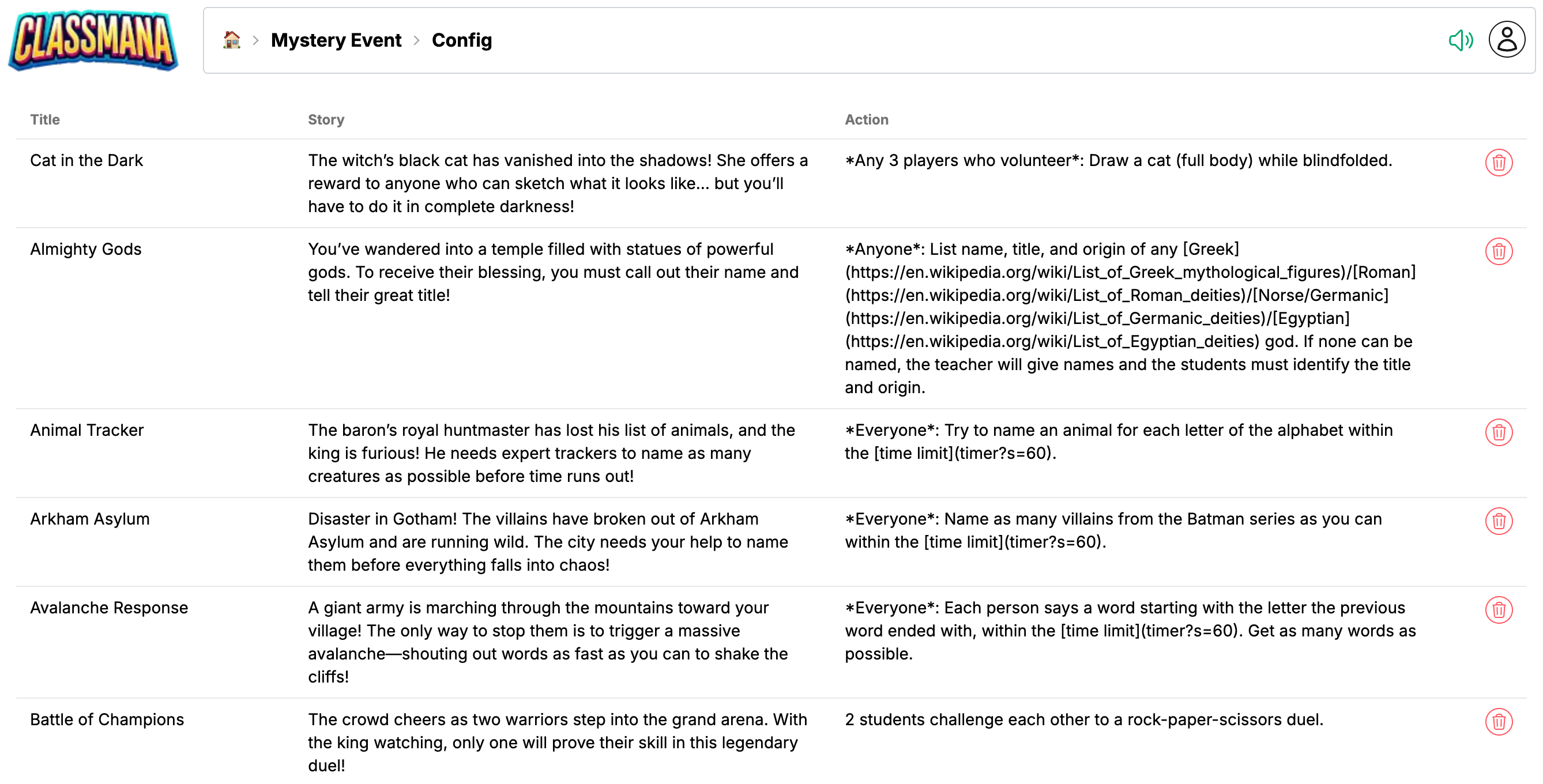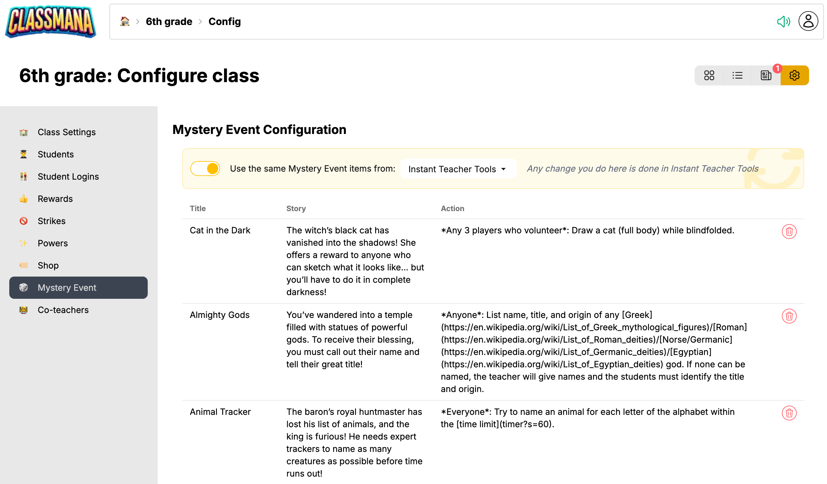 Nur der Klasseneigentümer kann die Mystery Event-Konfiguration ändern. Co-Lehrer können die Events ansehen, aber nicht ändern.