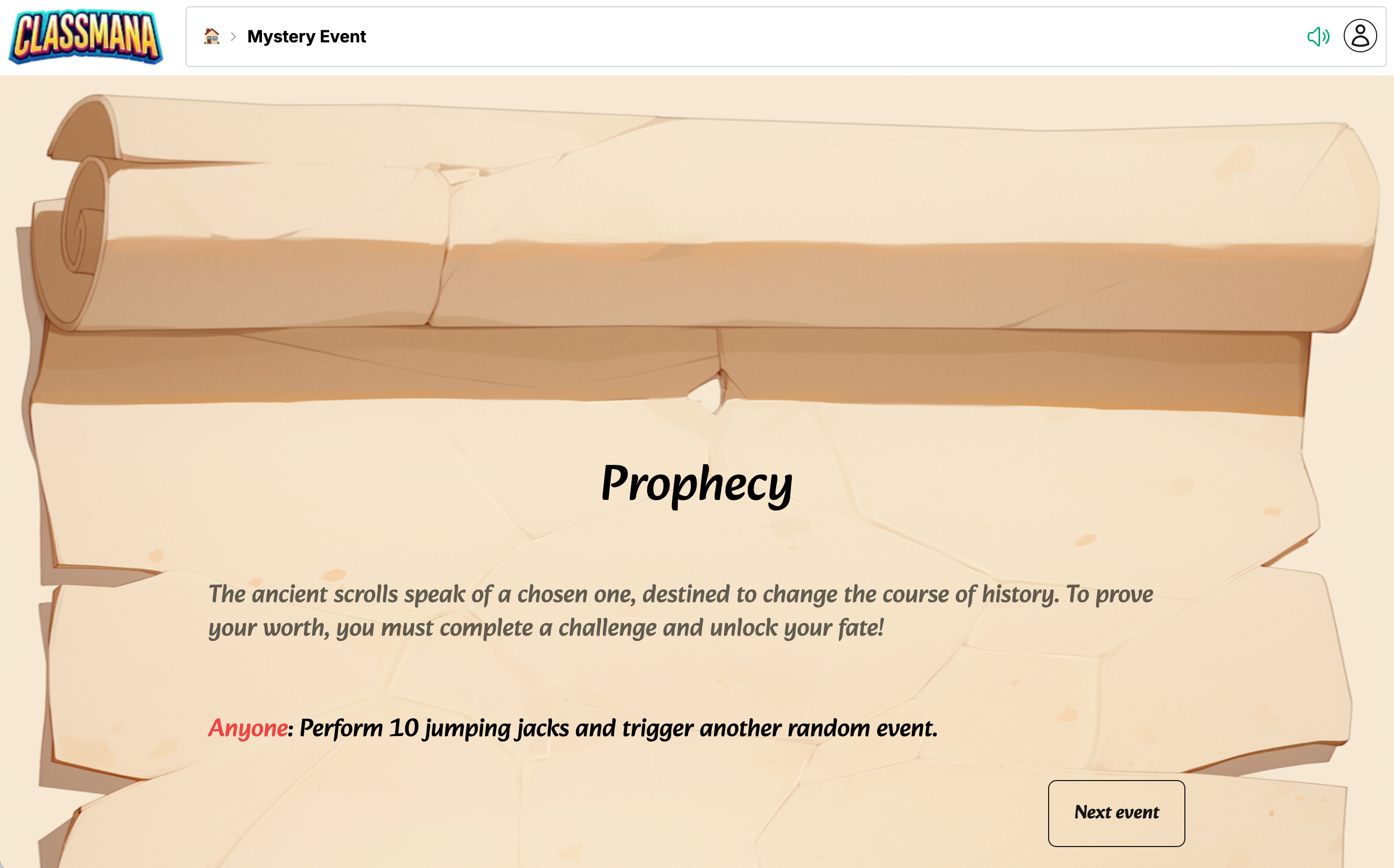 Mystery Events sind unterhaltsame, schnelle Aktivitäten, um Ihre Klasse bei der Stange zu halten. Verwenden Sie sie, um Ihren Unterricht mit Spannung zu beginnen, als Belohnung oder als Denkpause. Jedes Event dauert 1 bis 5 Minuten und fügt Ihrem Klassenalltag ein Element der Überraschung hinzu.